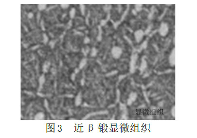 如圖3所示,為近β鍛工藝鍛件的顯微組織。其初生α含量約20%,條狀α沿原始β晶界分布,原始β晶粒尺寸較小,晶界基本破碎,為等軸α+條狀α+β狀的三態組織。